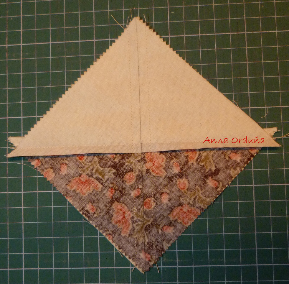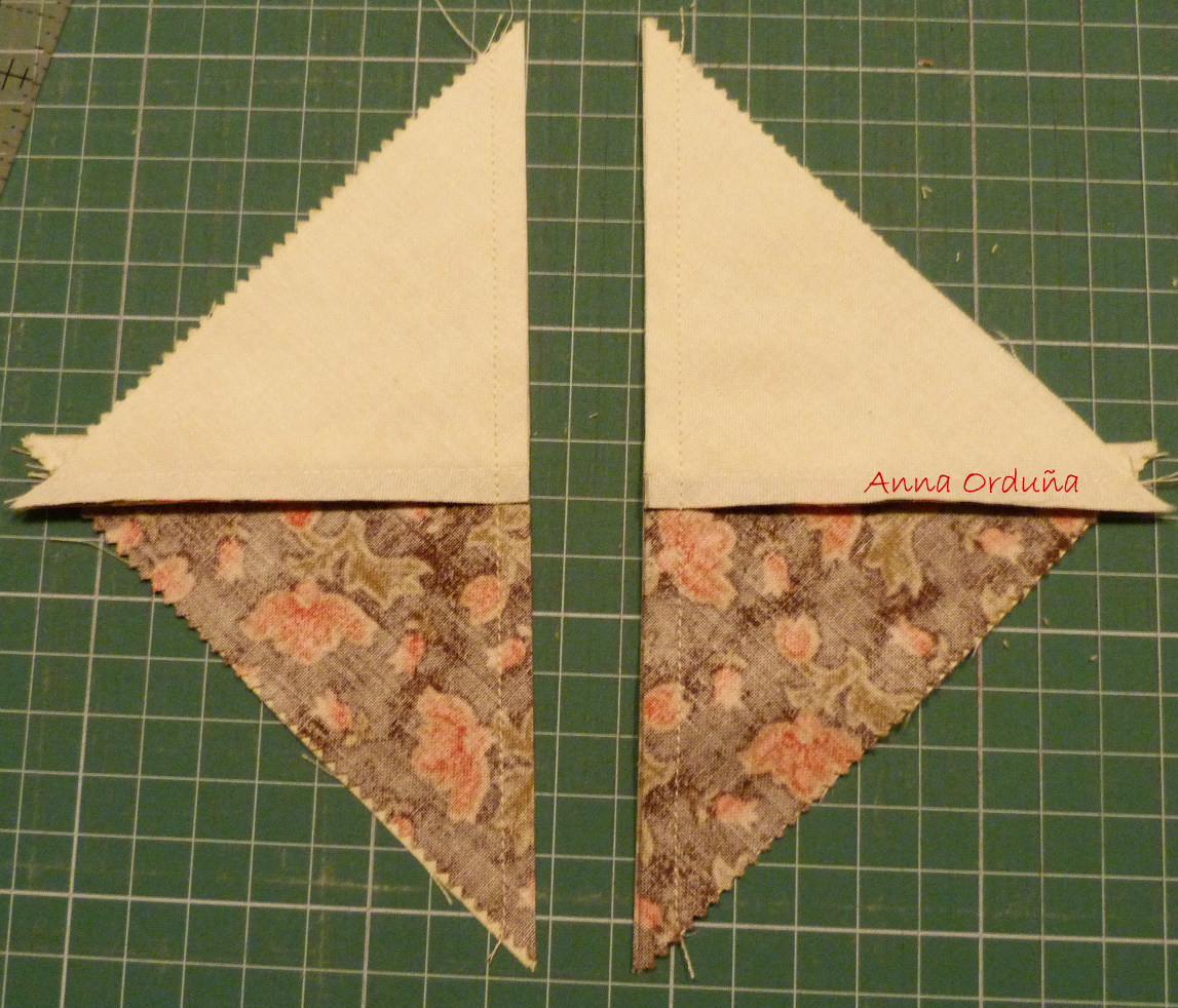 Coger otro bloque Half Square Triangle, con otros colores o con los mismos (a vuestro gusto) y encararlos como se ve en la foto, asegurándonos que las diagonales casan a la perfección.