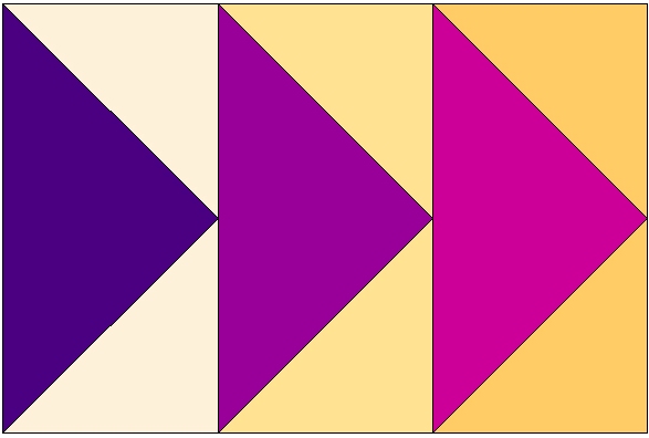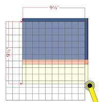 Por ejemplo, si necesitamos que nuestro bloque mida 4 1/2 x 2 1/2 pulgadas (11,4 x 6,3cm), tendremos que cortar el rectángulo a 5 x 3pulgadas (12,7 x 7,6cm), y los cuadrados a 3 pulgadas (7,6cm) de lado.